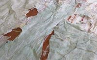 長崎県のM様からご依頼のあった掛け軸 で表面は御見せできませんが、1と2は 裏面で切断箇所にガムテープが貼ってあり、折れ箇所などもありました。3は表面のある箇所で裏にはガムテープが貼って ありました。 4はしみ抜きを施して完成した軸の3の部分です。ガムテープの成分が作品の紙の内に入っているせいか、少し黒くなって残りました。 切断箇所はあまり判らなくなりました。 5は完成した掛け軸を巻いた画像です。 |
