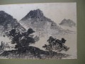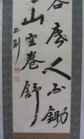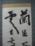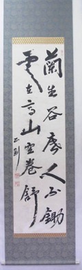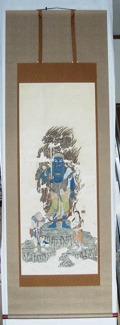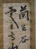 | この軸は、数ヶ月間雨ざらしになっており、墨字及び原紙部分があちこち流れて無くなっており、穴が開いている箇所 も多数ありました。しみ抜き後、新しい紙で穴などを補修して修復。 |