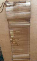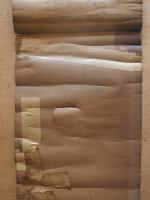 長崎県のM様からご依頼のあった掛け軸 で表面は御見せできませんが、1と2は 裏面で切断箇所にガムテープが貼ってあり、折れ箇所などもありました。3は表面のある箇所で裏にはガムテープが貼って ありました。 4はしみ抜きを施して完成した軸の3の部分です。ガムテープの成分が作品の紙の内に入っているせいか、少し黒くなって残りました。 切断箇所はあまり判らなくなりました。 5は完成した掛け軸を巻いた画像です。 |